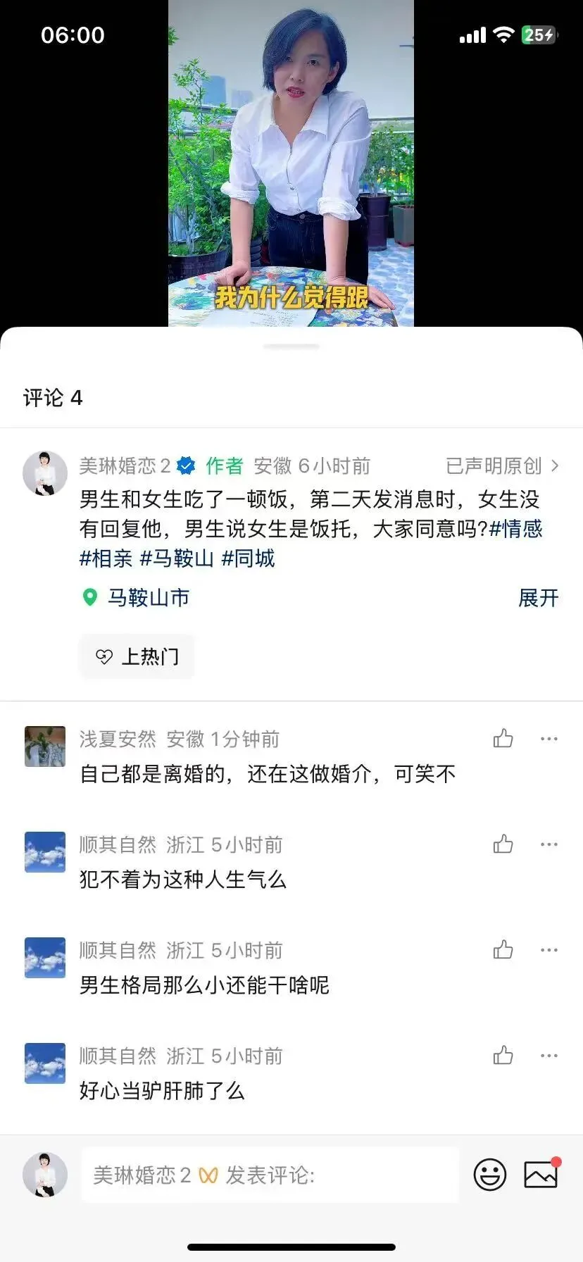 昨天发的一条视频,到一条视频,评论区里却有一条刺眼的留言:“自己都是离婚的,还在这做婚介,可笑不”。