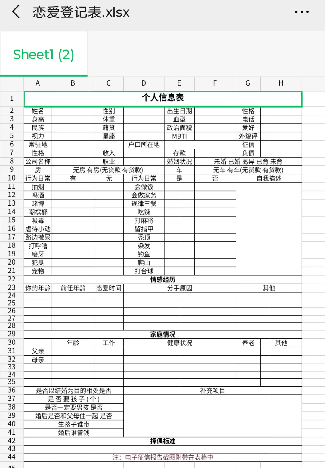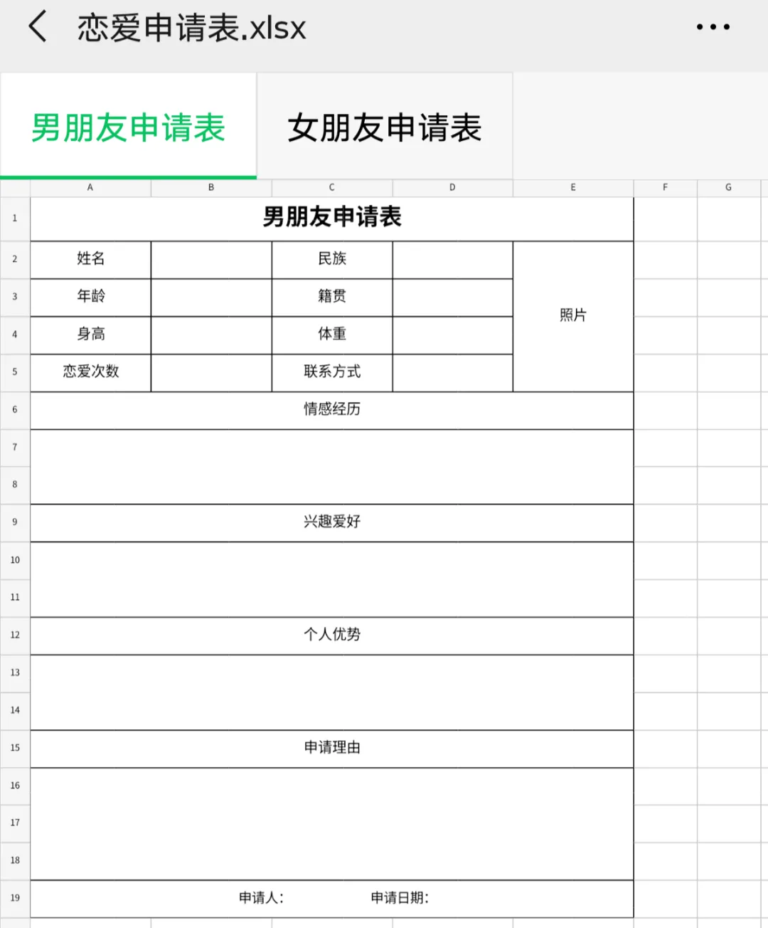 ✅ 恋爱申请表:告别“盲目脱单”!填清择偶偏好、个人优势、恋爱底线,情感经历一目了然,先筛选再奔赴,避免“错付型恋爱”,主打一个精准匹配、真诚至上,版本分为男朋友申请表和女朋友申请表,内容全面;