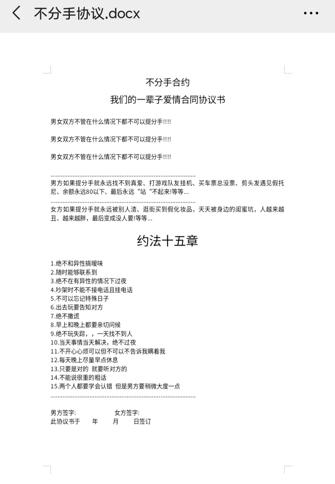 ✅ 不分手协议:主打一个“双向奔赴的承诺”,约定好遇到矛盾不逃避、不轻易说分手,吵架先冷静,再一起解决问题,守护来之不易的感情。