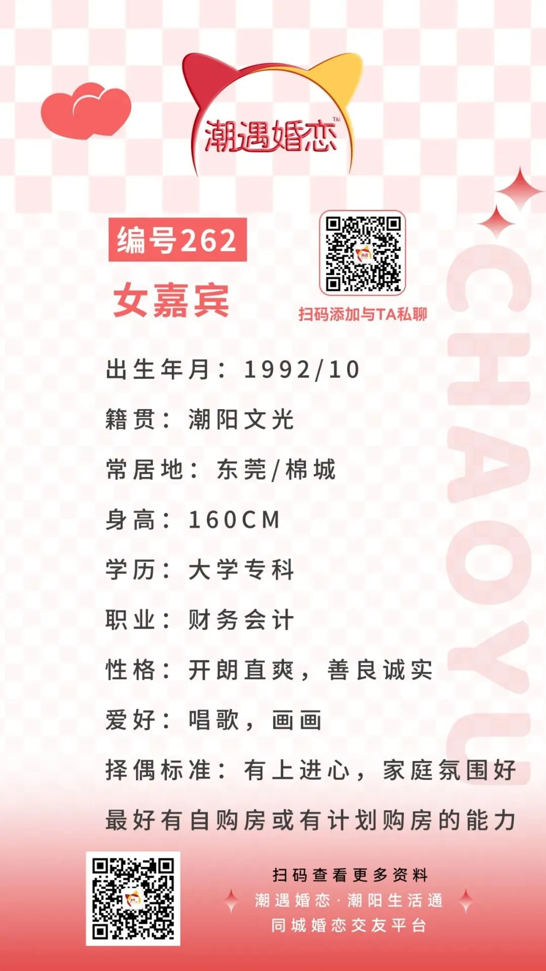 【潮遇婚恋】嘉宾:编号262号女嘉宾 · 常居东莞/潮阳,长相甜美~