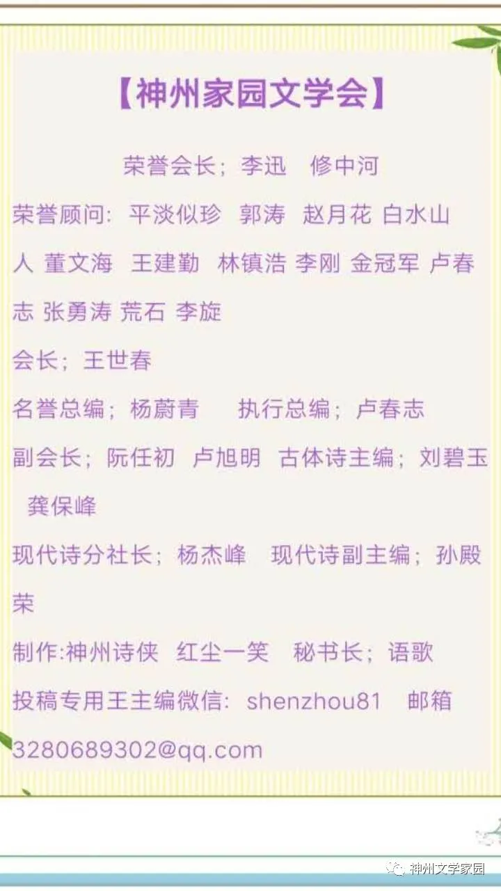 【神州文学家园】是一个旨在为文学爱好者提供展示才华纯文学平台,传播和弘扬中华传统文化,大力倡导正能量作品,选载诗友的优秀诗作,打造绿色网络的学习园地。