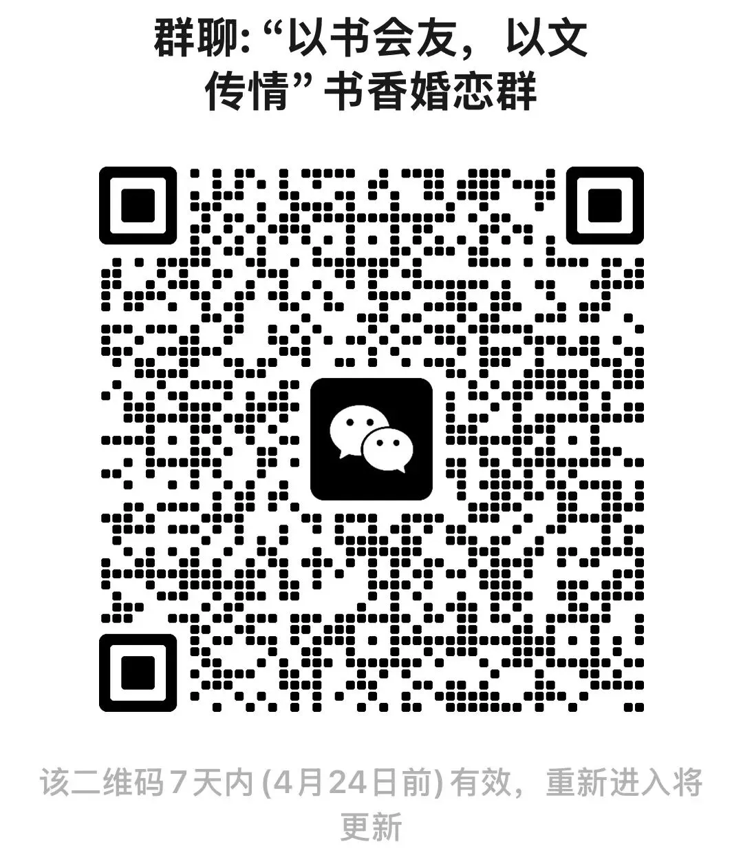 添加微信时,请备注:书香婚恋。为保证公益社群的纯粹与安全,需简单发送个人简介(年龄、职业、兴趣、择偶期待等),审核通过后即可入群。非诚勿扰,非爱阅读者慎入。