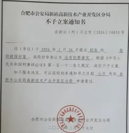 合肥市公安局新站高新技术产业开发区分局经审查,全面采纳了苏义飞、金子建律师的法律意见。2026年4月13日,公安机关根据《中华人民共和国刑事诉讼法》第一百一十二条之规定,以“没有犯罪事实”为由,正式作出不予立案决定。
