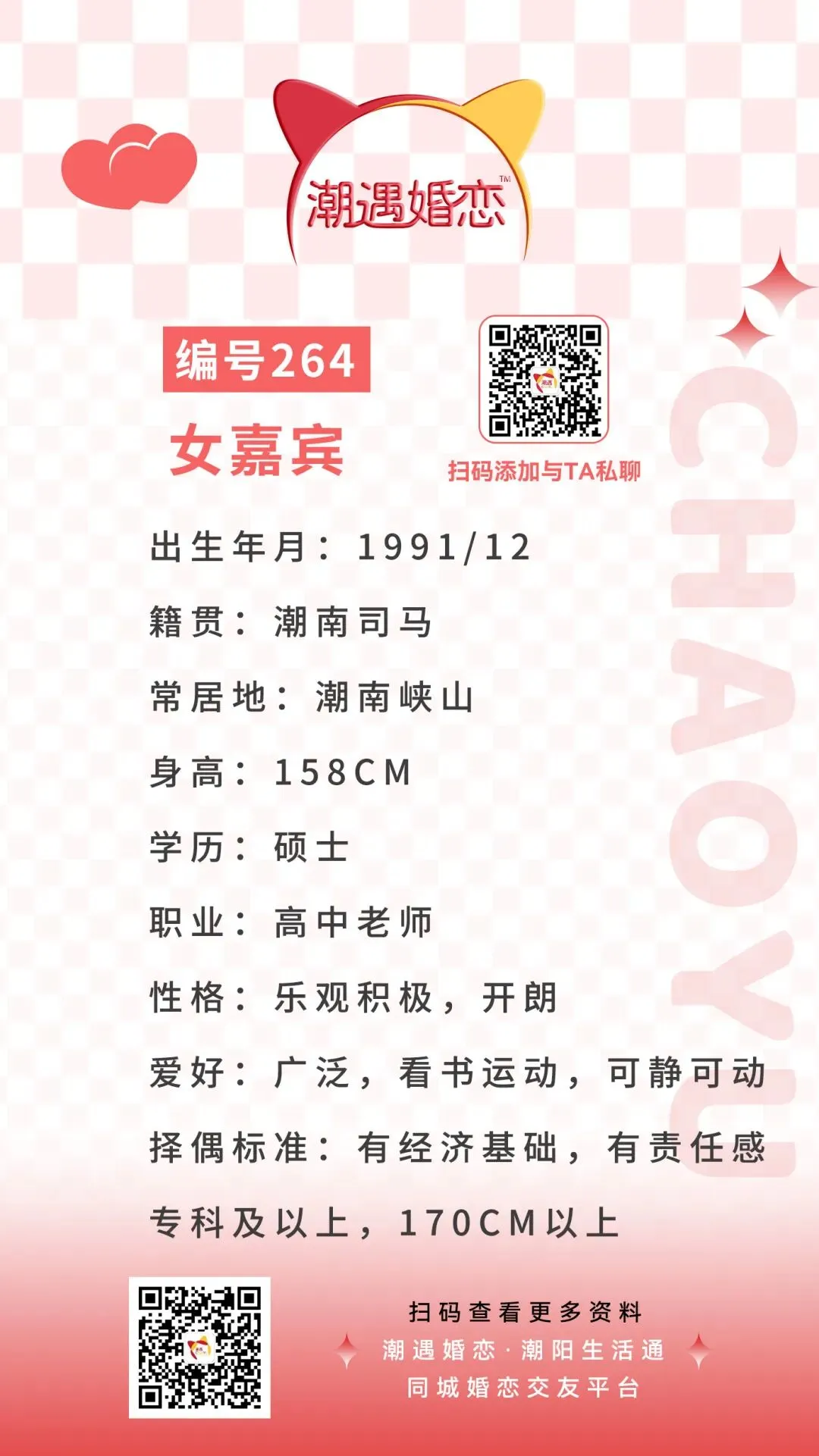 【潮遇婚恋】嘉宾:编号264号女嘉宾 · 常居潮南峡山,高中老师~