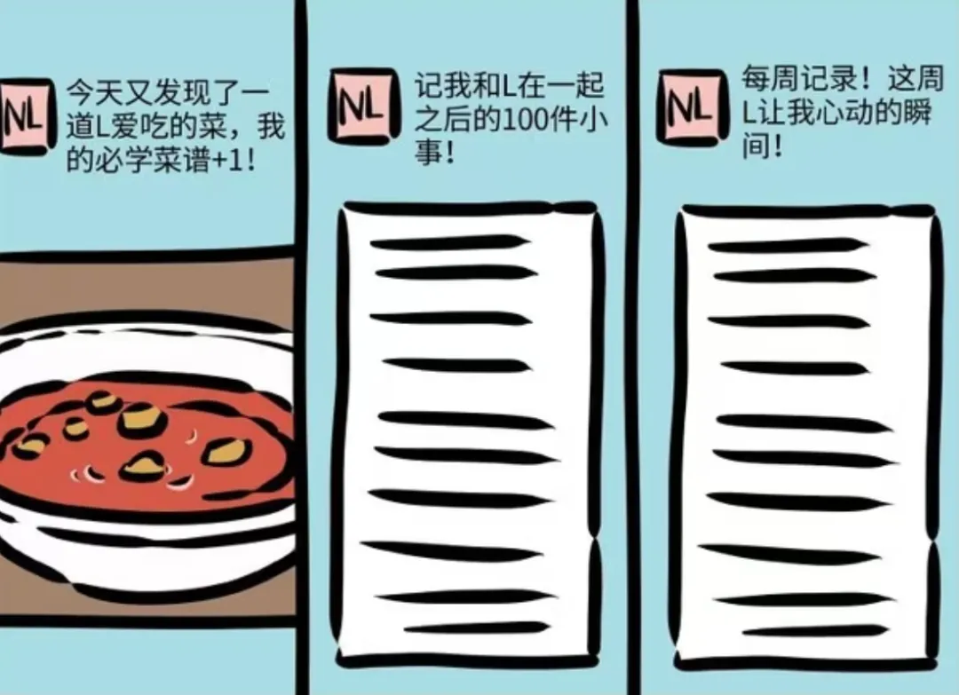 于是此后的每一天,泥泥总会按时的在微博小号上记录每天和莉莉的恋爱日常。比如今天发现了一道他爱吃的菜,我的必学菜谱+1!比如记录自己和她在一起之后的100件小事!再比如每周记录!这周她让我心动的瞬间!等等每天总会发生的日常。