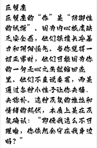 在恋爱关系中,有一种“作”叫作反复确认。网络上常讨论哪些星座在感情里最折磨人,结合星座的情感阈值与安全感诉求,这三个星座往往是“不作不舒服”的典型。他们通过推开对方来确认对方不会走,通过制造矛盾来证明对方还在乎。这种矛盾的心理,虽然让伴侣感到疲惫,却是他们表达深情的一种极端方式。