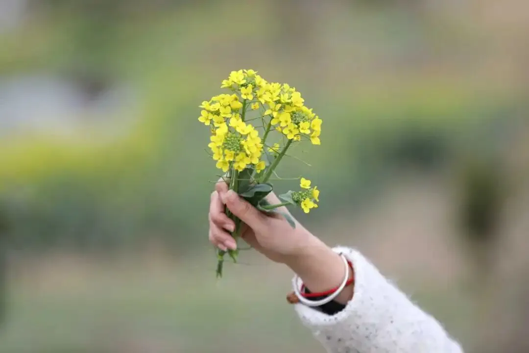 老公给她在油菜花田边,搭了竹篱笆,建了竹房,搭了秋千。秋千上浅浅插了黄色的菜花。