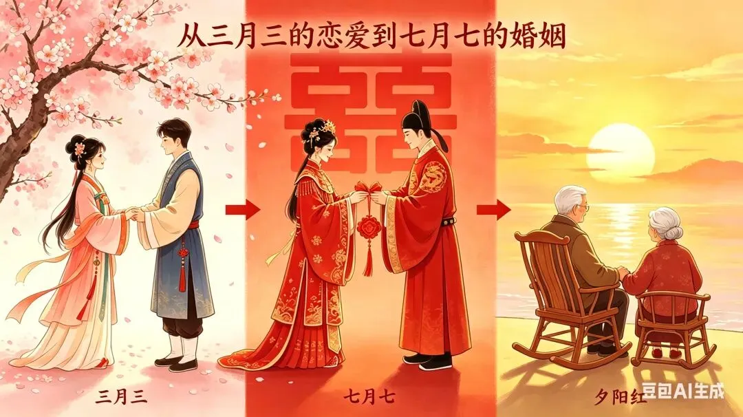 三月三用数千年的习俗告诉我们,恋爱要勇敢纯粹,不负心动;七月七用流传的故事告诉我们,婚姻要懂得坚守,不负初心。从大胆相爱到用心相守,才是一段感情最完整、最美好的归宿。