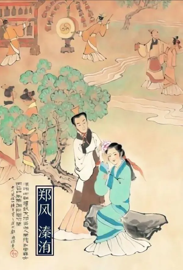 溱水和洧水清清冽冽的,河岸上青年男男女女熙熙攘攘的。女孩子说:“到那边去玩玩吧?”男孩子说:“我刚刚去过了。”女孩子说:“何妨再去一次呢?洧水的岸边,真的是宽敞又热闹!”一男一女向河边走去,一路上开着玩笑,采下芍药互相赠送。