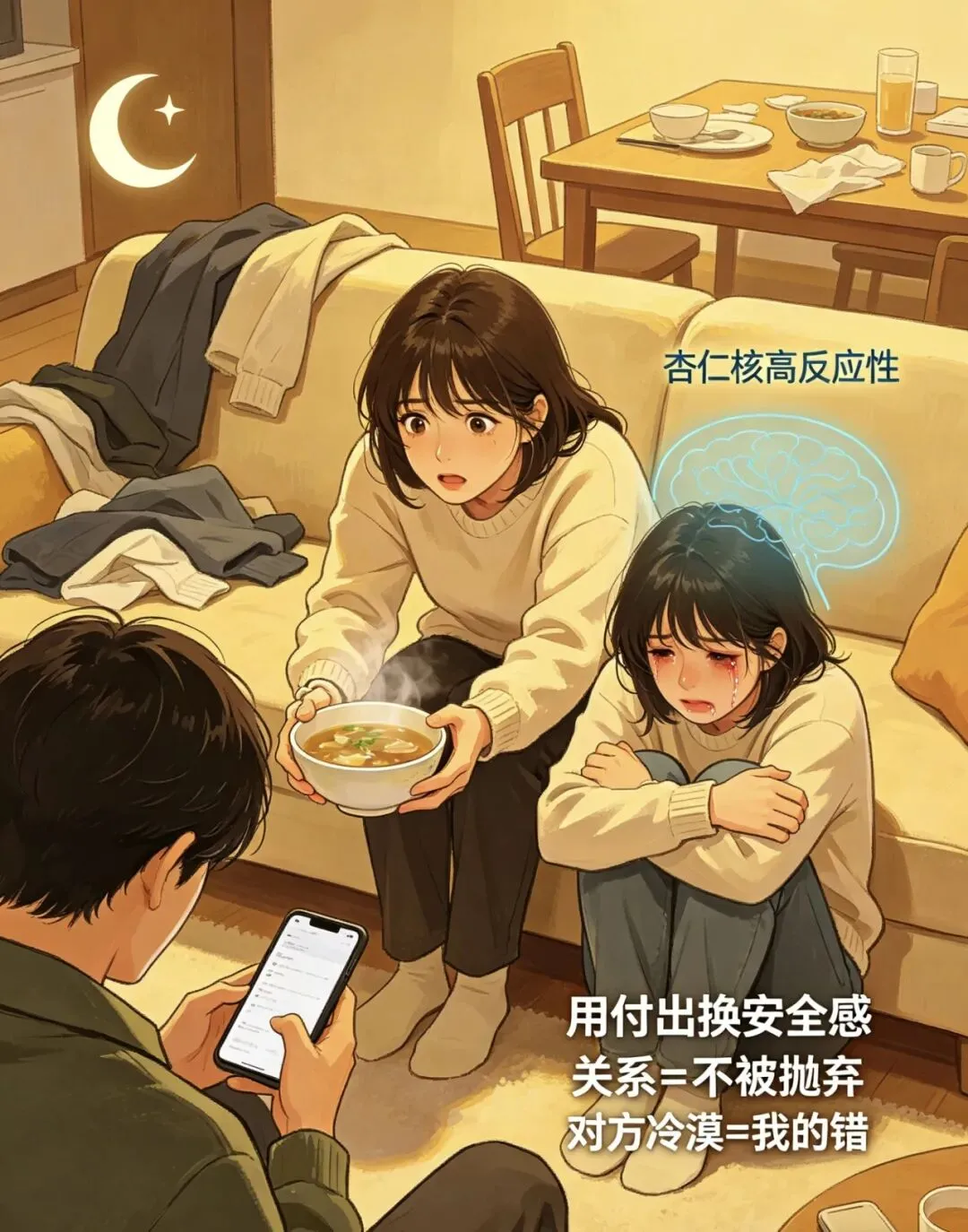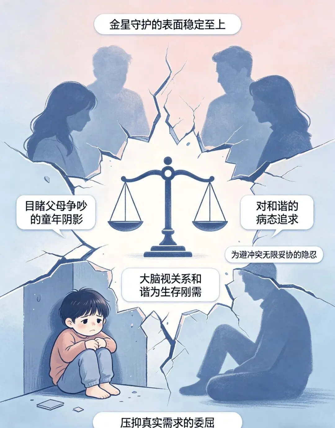 目睹父母争吵或经历关系破裂,形成对和谐的病态追求。为避免冲突无限妥协,大脑将关系表面稳定视为生存刚需,甚至压抑真实需求。
