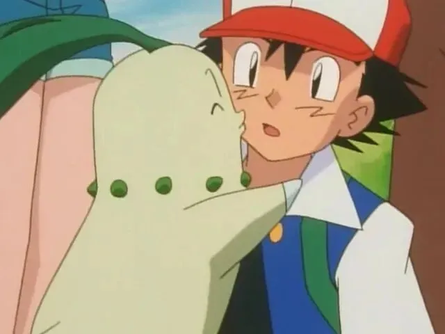 它第一次登场就气场拉满:在草地上休息被小智打扰,非但不逃,反而主动甩动叶子挑衅。小智先后派出妙蛙种子、喷火龙与它对战,这只小小的菊草叶哪怕面对强大的喷火龙,也敢用藤鞭正面硬刚、绊倒对手,宁肯撞晕过去也绝不退缩。真正打动它的,不是战斗,而是小智的温柔。受伤后小智一路抱着它去治疗,即便被它咬手臂也不松手;雪山遇险,小智不顾风雪寻找冻得发抖的菊草叶;火箭队来袭,它亲眼看到小智拼命保护自己。那一刻,这只倔强的菊草叶彻底放下所有防备,主动跳进小智怀里,自愿被收服。从这天起,它的世界里,只剩下小智一人。二、占有欲拉满:全宝可梦第一“吃醋王”