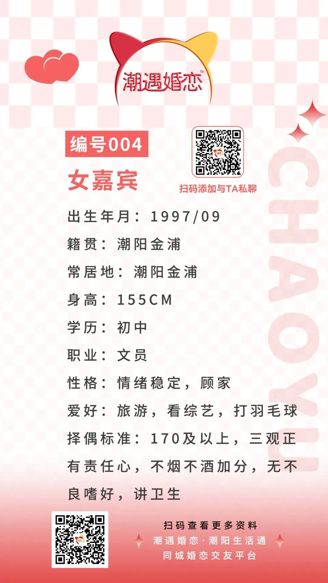 诚意想与嘉宾认识的可扫码联系潮遇红娘牵线,将本期嘉宾的编号/交友卡片发送给潮遇红娘,开启心动模式,与嘉宾微信聊天深入了解哟!
