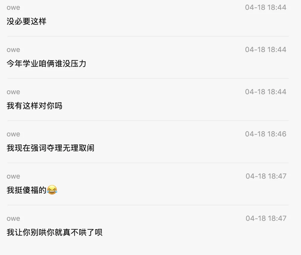 事后苦主和他对峙,问他为什么要骂自己,对方却翻脸不认账,反问她“我什么时候骂过你”。苦主气不过,就去翻聊天记录找证据,结果刚回复了一个“一”,还没来得及把证据发过去,对方又一次骂了过来。