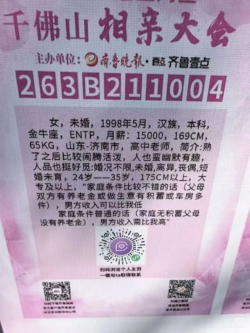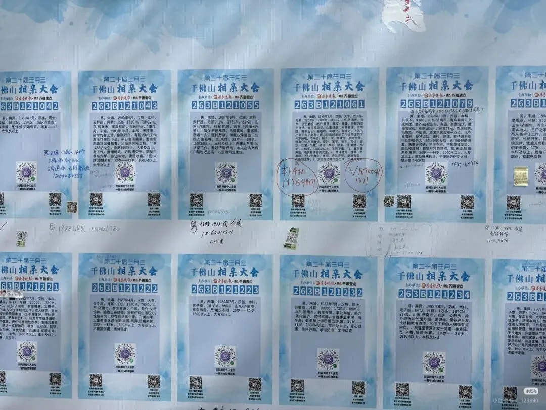 而如今的庙会也成了相亲大会的主场。一张大布幅贴在墙上,一张张自我介绍的纸张随处可见。