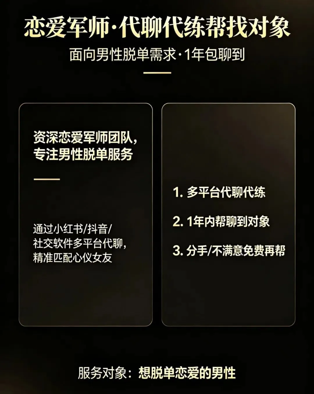 在这个人人都只讲方法、没人保结果的情感市场里,直击你脱单的核心痛点,我们推出全程代聊代练、亲自下场帮你找对象的实战服务,敢做别人不敢做的承诺,敢保别人不敢保的效果!