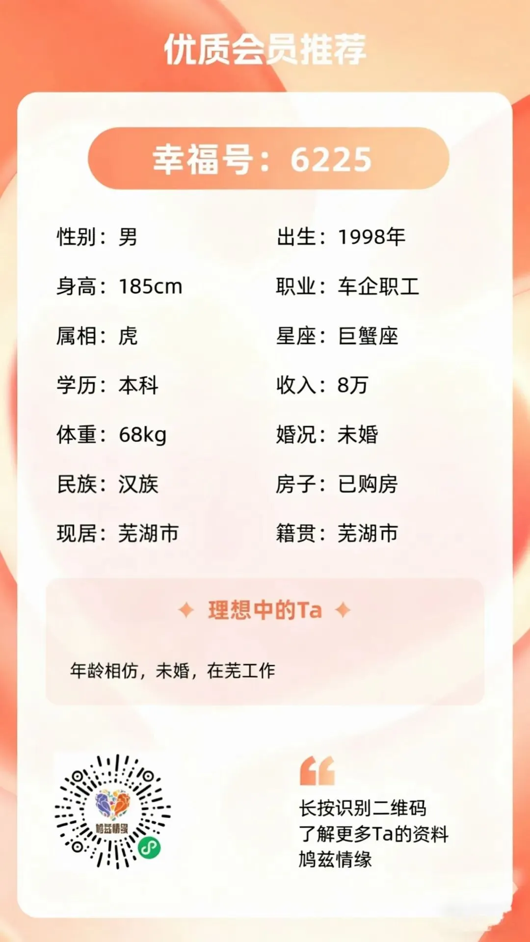 如果你也是芜湖单身,不想再“瞎找”,不想再等“缘分随机降临”,就来芜湖鸠兹情缘吧!这里有和你一样认真找对象的人,有8年专业和服务帮你铺路,下一个晒结婚证的,就是你!