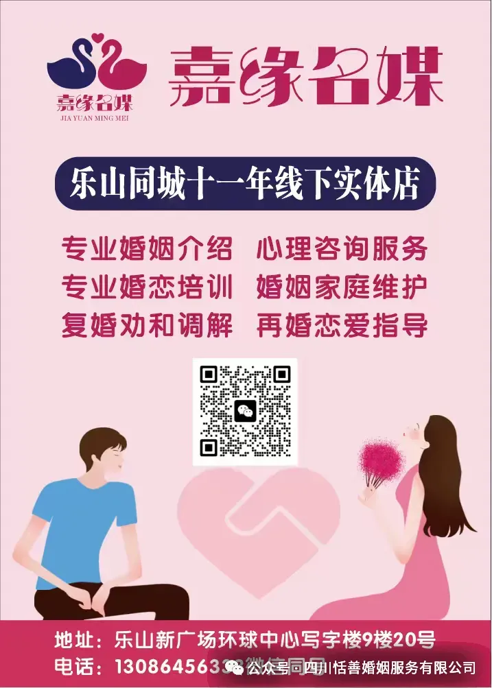 地址:乐山市市中区新广场CBD环球中心写字楼9-20(嘉缘名媒VIP服务中心)