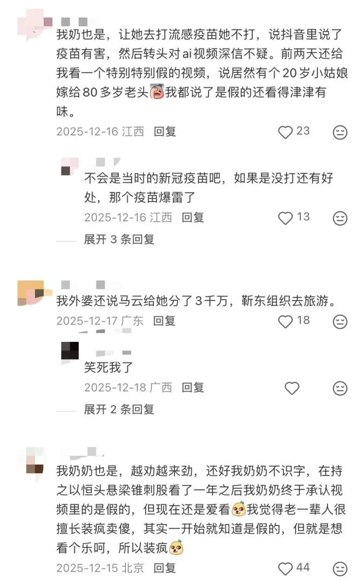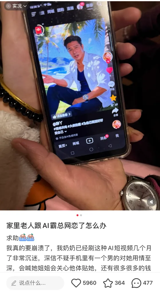 “我真的要崩溃了!我奶奶已经刷这种AI短视频几个月了,她非常沉迷,深信不疑手机里有一个男的对她用情至深,会喊她姐姐,会关心她体贴她,还要把公司过继给她!”小红书上这条吐槽,短短几天收到五千多点赞。评论区里,有人说自己奶奶相信了假靳东组织去旅游,还有人说妈妈为了AI课花了上万块钱,心愿是跟导师一起靠短视频月入十万。