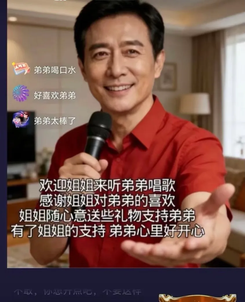 那个男人叫“建国”,在视频里永远是五六十岁的模样,浓眉大眼,国字脸,两鬓微白,穿着深色polo衫或者西装外套,背景不是书柜就是落地窗。他每天准时出现在奶奶的短视频推荐流里,用一模一样的温柔语气说:“姐姐,你是我见过最美好的人”“你的善良我都记在心里”“我愿意做你的护盾”。