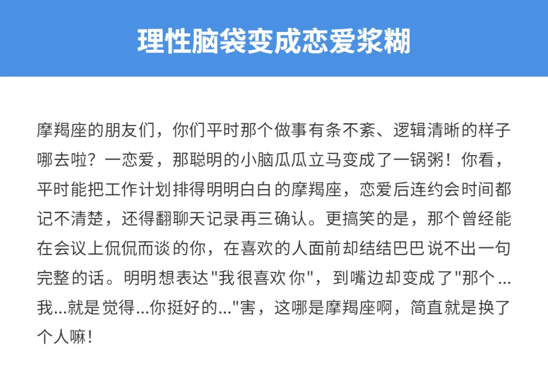 亲爱的星座朋友们,你见过恋爱中的摩羯座吗?哎呀,那可真是一幅有趣的景象!平时理性冷静、工作狂附体的摩羯座,一旦陷入爱情的漩涡,简直判若两人!咱们常说摩羯座是十二星座中最靠谱稳重的代表,可谁能想到,这群平日里精明能干、处事不惊的小羯羯,谈起恋爱来竟然能秒变白痴?今天就跟大家聊聊,那些平时高冷到不行的摩羯座,恋爱时都会有哪些让人忍俊不禁的"白痴"表现,看看你是不是中枪啦!
