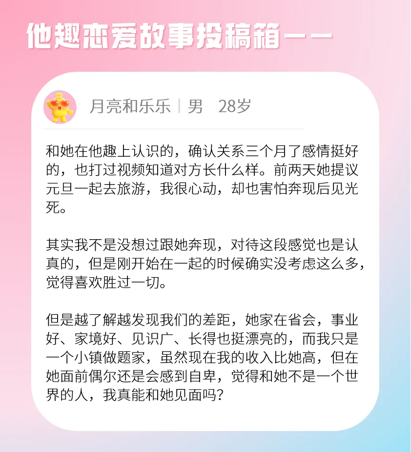 在他趣的恋爱故事投稿箱中,不少网友都有着相似的困扰,其中@月亮和乐乐 提出的“自卑不敢和网恋女友见面”,更是戳中了许多网恋人群的内心。这种纠结与不安并非个例,但若始终止步于屏幕,感情便永远无法落地生根。奔现从不是一场豪赌,而是确认心意、让感情走向现实的必经之路,过度畏惧只会让缘分悄然错过。