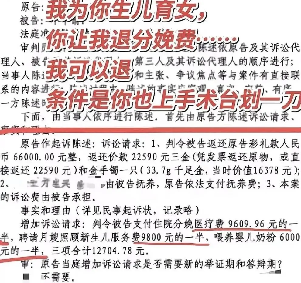 就在她最脆弱、最需要照顾的时候,男方直接向法院起诉,要求返还彩礼、三金及各项费用。