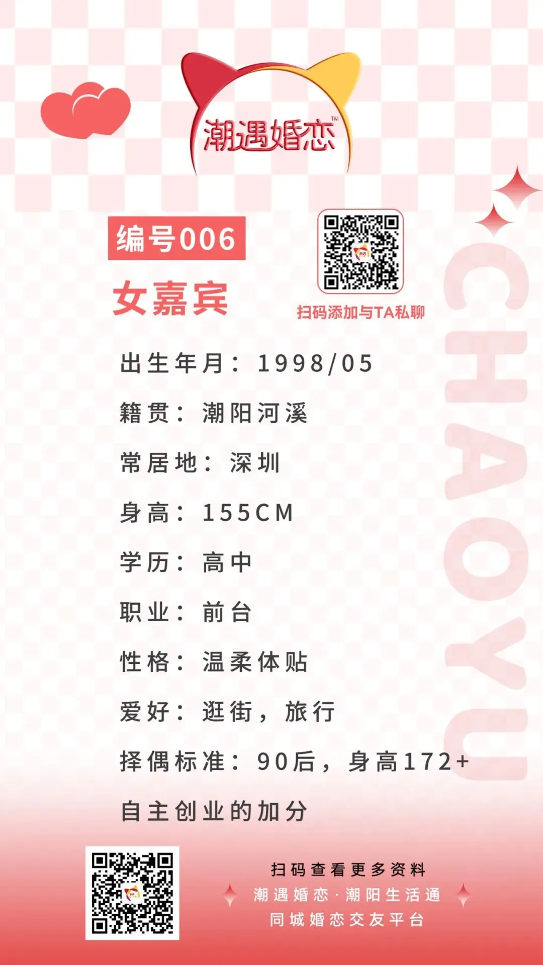 诚意想与嘉宾认识的可扫码联系潮遇红娘牵线,将本期嘉宾的编号/交友卡片发送给潮遇红娘,开启心动模式,与嘉宾微信聊天深入了解哟!