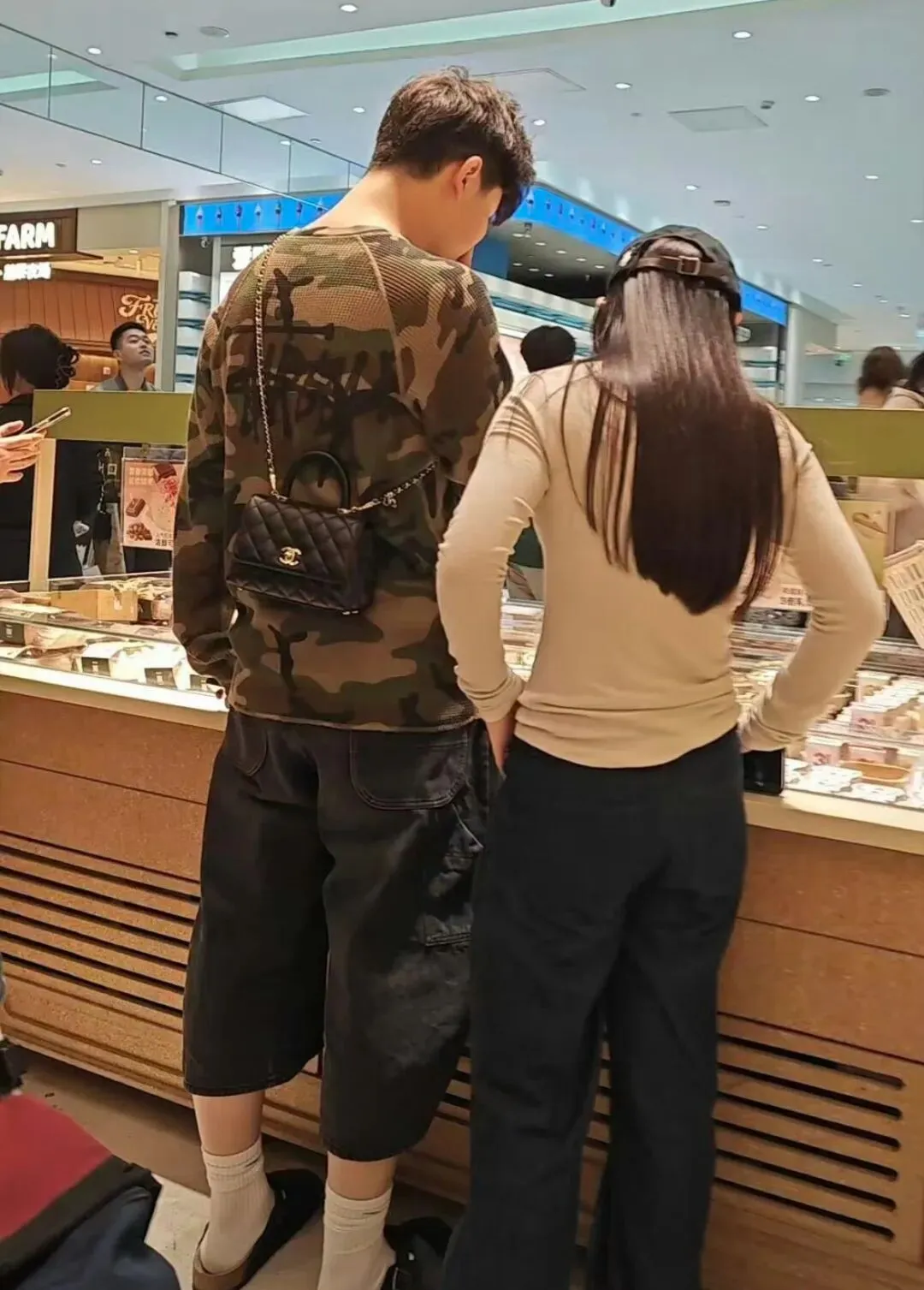 当天,他穿迷彩T恤,九分黑短裤,肩背香奈儿格纹包,潮范儿十足地陪女生逛街。女生身材高挑,与安吉约半头身高,二人在货柜前挑选商品。