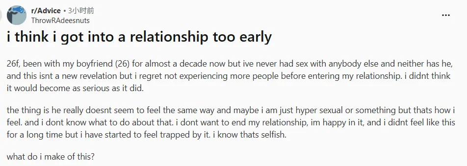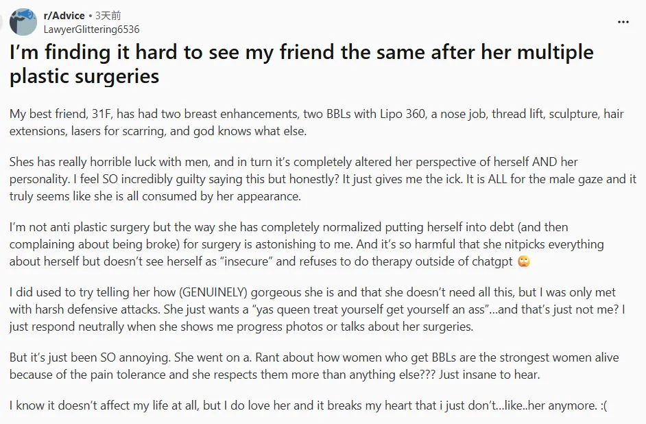 我们在关系中寻找安稳,却有时会突然被“如果当初”的念头击中;我们以为伴侣在向AI倾诉压力,却发现那是内心最恶毒的独白;我们想支持朋友变美,却眼睁睁看着她陷入整容贷款的无底洞。今天,我从海外论坛挑选了三个近期引发热议的“求助帖”。这些故事没有惊天动地的出轨,却充满了让人窒息的现实无力感。如果你是故事里的主角,你会怎么做?请在评论区留下你的建议。我和男友都是26岁,我们在一起快十年了。我们彼此都是对方的唯一,从来没有和其他人发生过关系。这不是什么新发现,但我最近越来越后悔在定下来之前没有多经历几个人。当初我也没想到这段关系会变得这么严肃长久。问题是,他似乎完全没有这种感觉。也许是我欲望太强?我不知道该怎么办。我不想分手,我在关系里也很开心,甚至很长一段时间都没这种感觉,但最近我开始觉得被这段关系“困住”了。我知道这听起来很自私。【楼主求助】:这种“没玩够”的遗憾是正常的吗?还是说明我其实没那么爱他?我该怎么处理这种心态?我和男友(均21岁)在一起两年了,我一直以为他就是“真命天子”。最近他压力很大,我哪怕自己精疲力尽,也一直在听他倾诉、给他建议、安抚他。昨晚我手机没电了,用他的手机(我们平时互相信任,知道密码)。我看到他开着Claude(AI聊天机器人),以为是学校作业,结果点开一看,光是今天就有20多个新对话。最新的一个对话里,他在抱怨作业多,然后说我试图共情他简直“好笑”,说我也就在那抱怨做家务这种破事。接着,他骂我是个“useless lazy ct(没用的懒惰贱人)”。我简直不敢相信。我为了帮他累得半死,他私下里居然这么看我?更恶心的是,之前的记录里他还问AI,我经常和朋友出去玩是不是“荡妇”,我朋友是不是也是荡妇。我没敢再看下去,感觉太恶心了。我质问他,他解释说只是因为焦虑在发泄。但我感觉这不仅仅是发泄,这暴露了他对我真实的鄙视。【楼主求助】:当面一套背后一套,甚至用这种侮辱性的词汇跟AI骂我。这种“AI面纱”下的真实人格,我还能信任吗?我最好的朋友(31岁)这两年像变了个人。她做了两次隆胸、两次丰臀(BBL)、抽脂、鼻整形、线雕、植发……甚至更多。她感情不顺,这彻底改变了她的自我认知。说实话,我很内疚,但我看着她现在的样子真的觉得“很下头”。这一切都是为了取悦男性,她完全被外貌焦虑吞噬了。我不反对整容,但她为了手术欠了一屁股债,转头又跟我哭穷,这让我很难理解。而且她极度自卑却不自知,拒绝看心理医生,只用ChatGPT聊天解惑。我以前夸她天生丽质,她却攻击我。她现在甚至发表暴论,说能忍受BBL疼痛的女人是“世界上最强的女人”,比谁都值得尊敬。我听着只觉得荒谬。我知道这不关我的事,但我爱她,我很心碎,因为我发现我不再“喜欢”现在的她了。【楼主求助】:看着好朋友一步步走向极端,价值观完全崩塌,我该继续冷漠旁观,还是做最后一次努力?“唯一”的性伴侣在某种文化下是浪漫,在另一种心境下却成了束缚。这种遗憾如果不解决,迟早会变成怨气。AI成了现代人的树洞,也成了照妖镜。当一个人以为自己在私密空间发泄时,往往暴露了最真实的修养和爱意。有时候,友谊的终结不是因为吵架,而是因为价值观的差异变得无法跨越。