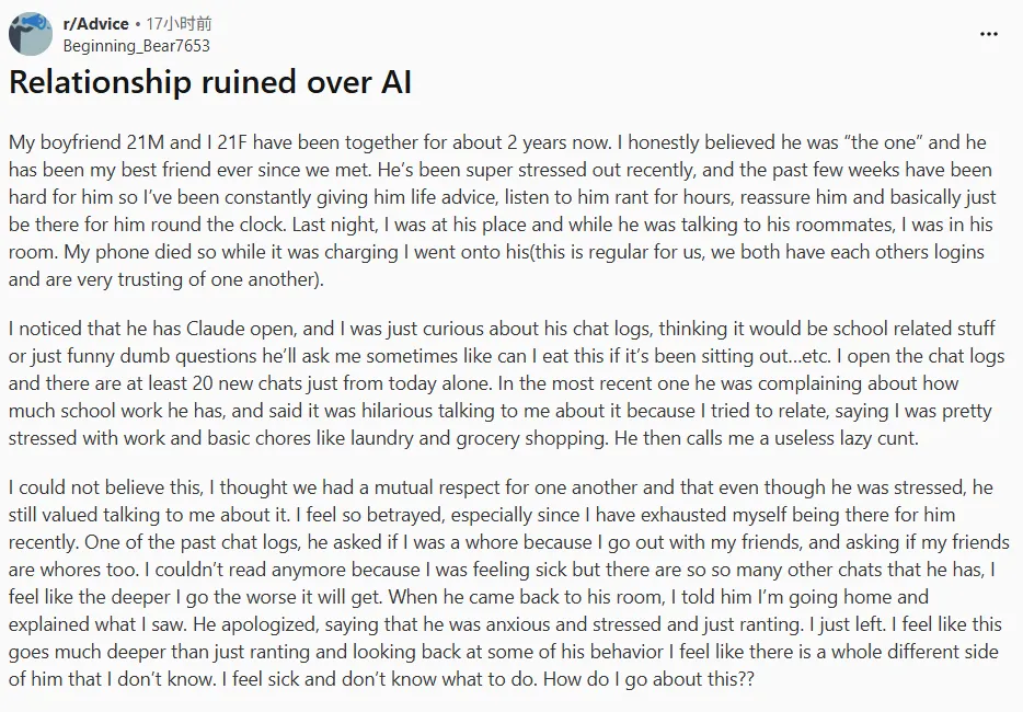 恋爱10年后悔没睡过别人、男友在AI面前骂我“贱人”、闺蜜整容上瘾欠巨债:这3个海外帖子,越看越让人心累!