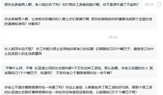 说实话,我看第一遍的时候,没看懂。真的,我逐字逐句读了三遍,才勉强理清楚她想表达什么。大概就是说:你提倡平等?那你工资低,拖累老公,应该抽自己嘴巴子;你凭什么要求全国女性按你的标准来?