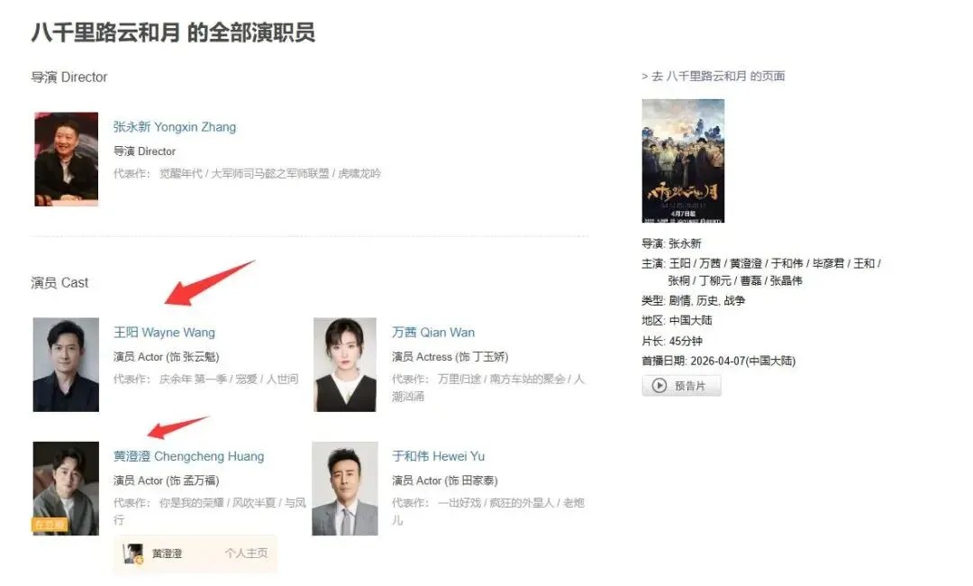 再说第二点,《八千里路云和月》到现在为止,我还真不敢确定这是什么类型的剧。一条战争,一条生活,双线并行可以明显看出两个叙述视角。但说双男主吧,演员表序列第一的是王阳,第二万茜,第三才是黄澄澄。本以为王阳的戏份会多,没想到,到目前为止,排名第三的黄澄澄才是戏份最多的那个。第一集就亮相,到后面被抓夫、逃跑、逃难,再到与张云旗(张云魁表弟)夫妻的斗智斗勇。这部剧演到了22集,黄澄澄的孟万福占了70%,甚至还要多。反观另一边,王阳饰演的张云魁更像是广告,时不时出现报告一下申冤进度,而反差最大的战争戏干脆用几段MV慢镜头一笔带过。最后