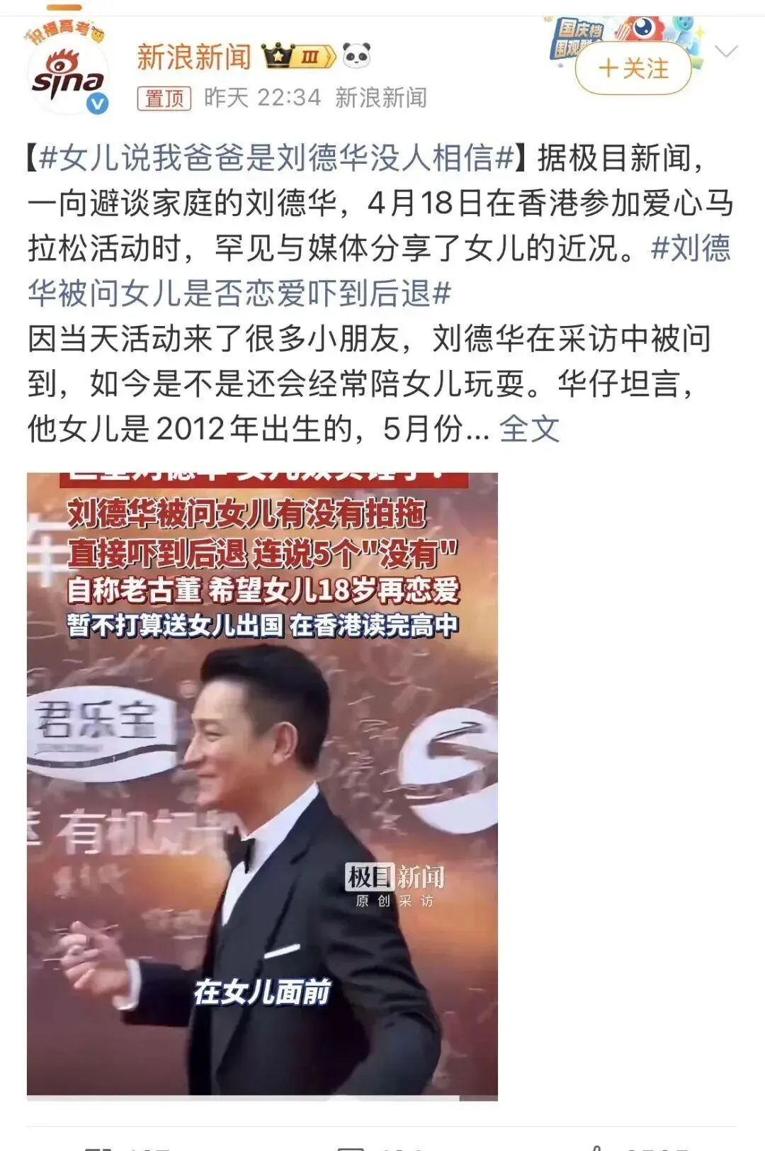 闺女喊"我爸是刘德华"为啥没人当真.天王巨星当爹这种离谱说法谁信啊.华仔要真有这么大个闺女早被狗仔扒得底朝天了.现在网上冒充名人亲戚的骗子还少吗.小姑娘八成是追星追魔怔了.要不就是跟同学吹牛没过脑子.真当吃瓜群众这么好忽悠呢.