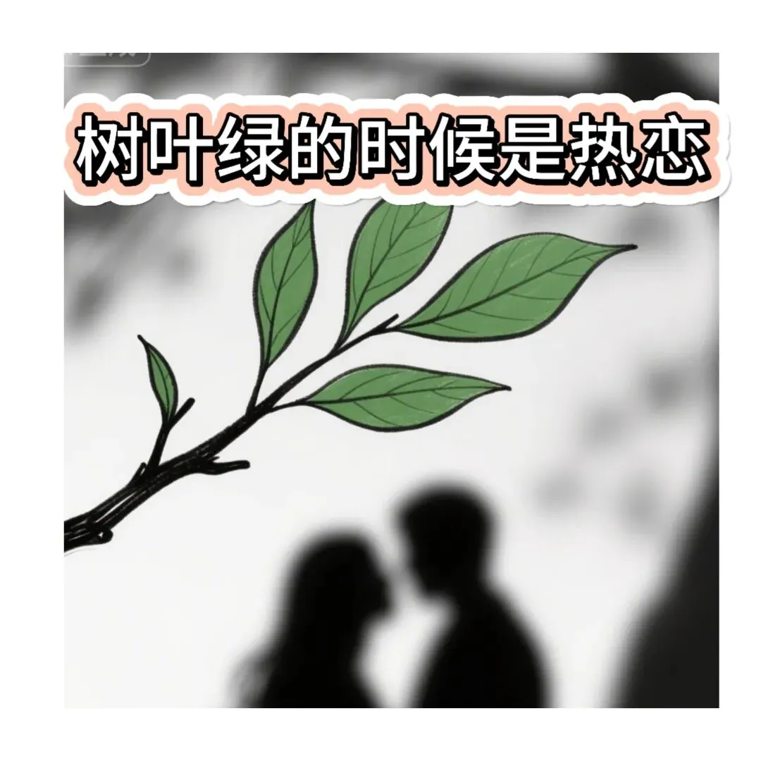 1 黑白手绘风格 一片翠绿的树叶在枝头随风摇曳 背景是模糊的恋人剪影 画面静止
