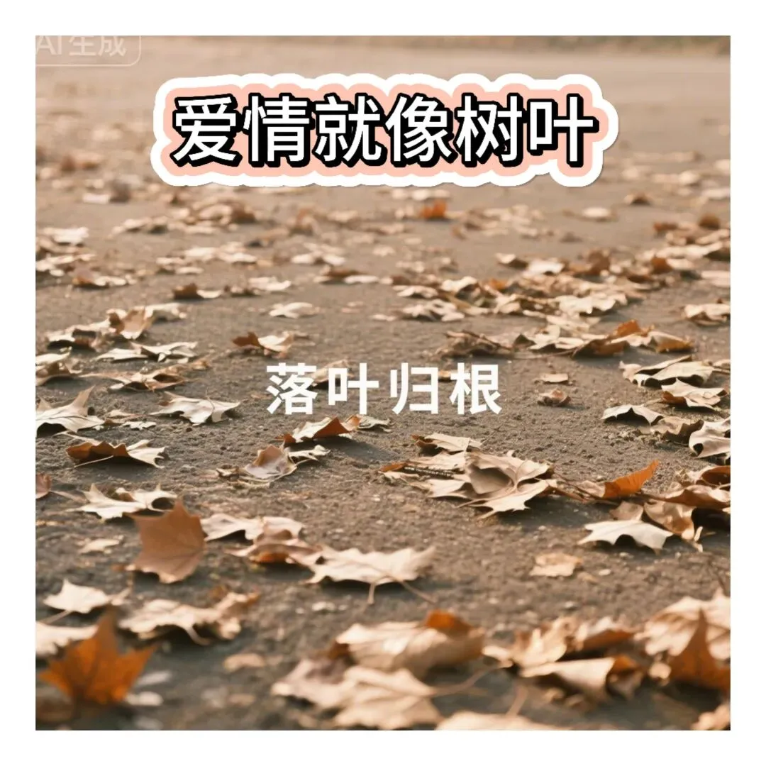 5 无数落叶铺满地面 镜头从地面升起 展现空旷的场景 配文落叶归根 画面缓慢模糊