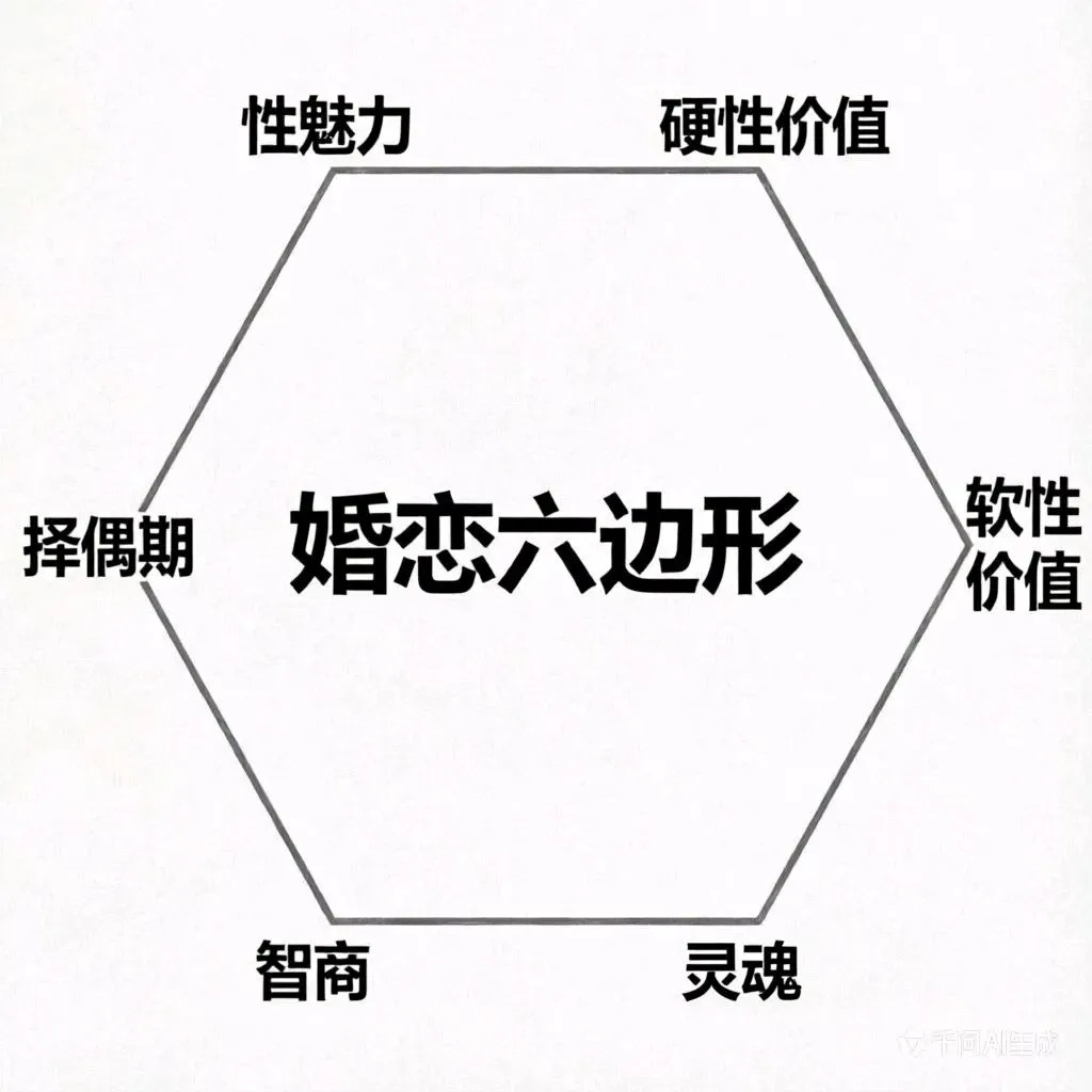 以上就是找对象的框架,性魅力、硬性价值、软性价值、灵魂、智商、择偶期,这个就叫婚恋六边形。