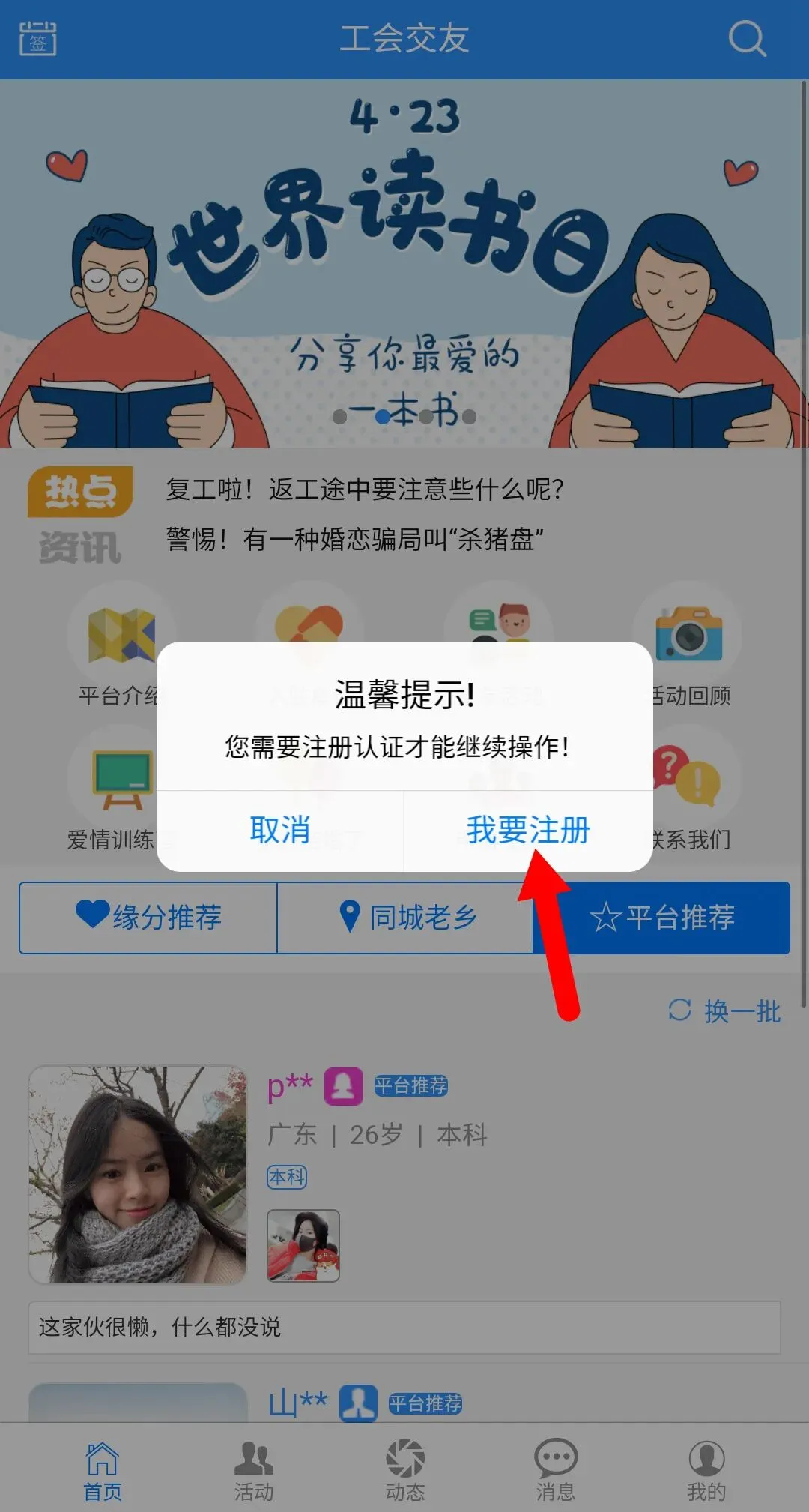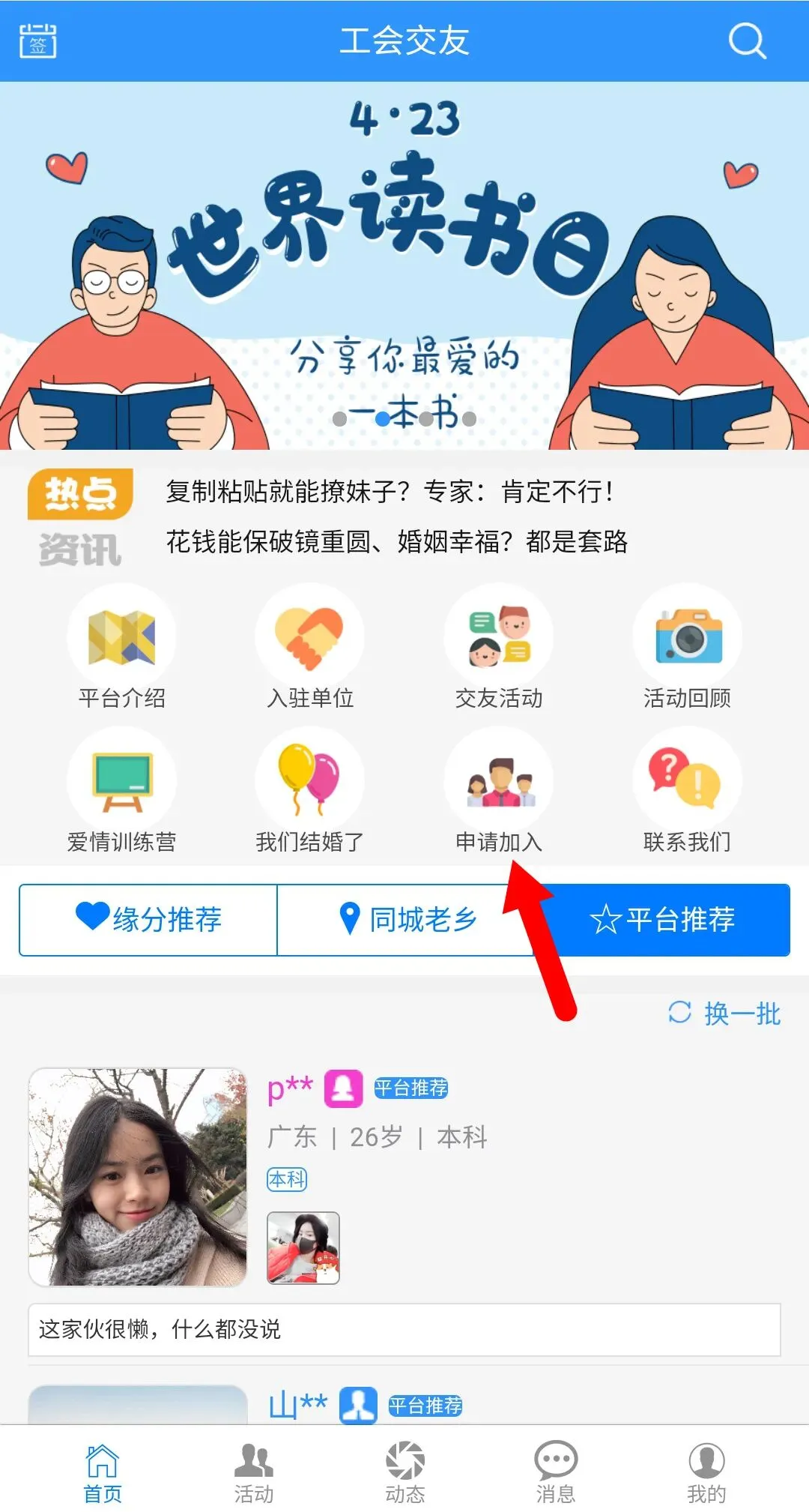 同时,为使用户更多更好地从线上走到线下,从网友变成朋友,加深了解和沟通,平台会在元宵节、“5.20”、“七夕”及“双11”等节日举办大型线下节庆主题交友联谊活动,或联合各街道总工会开展线下专场活动,并于平日不定期组织音乐、桌游、运动、读书等职工交友兴趣圈子,目前已吸引千余名单身职工报名参加。