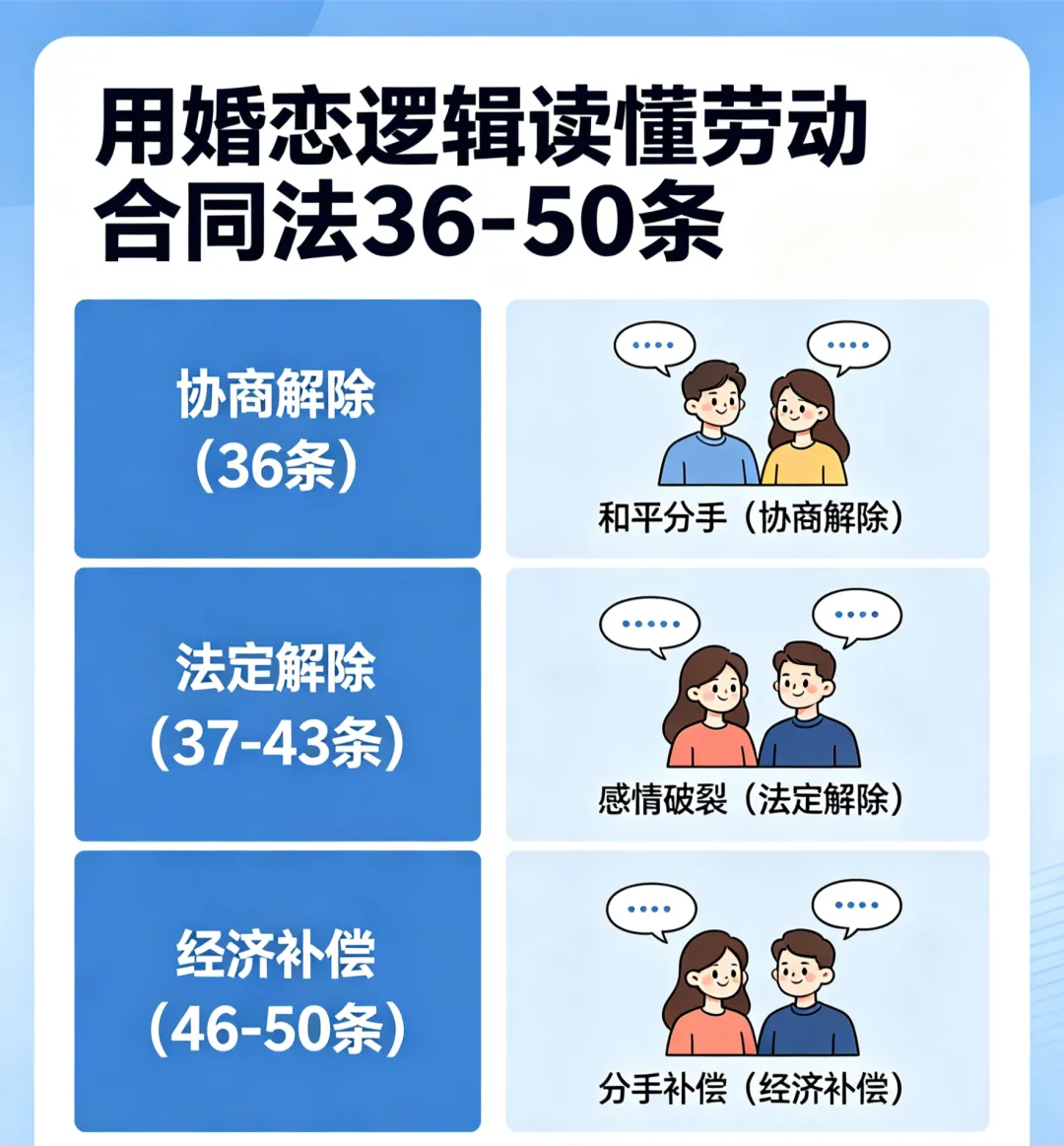 把劳动关系 ≈ 恋爱/婚姻关系,把解除/终止 ≈ 分手/离婚,非常形象好记。下面用这个思路,把《劳动合同法》第36~50条(劳动合同的解除和终止)全部串一遍: