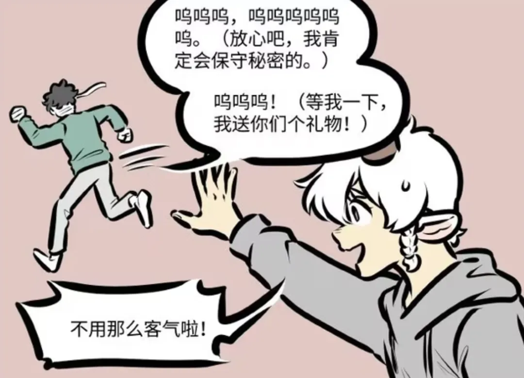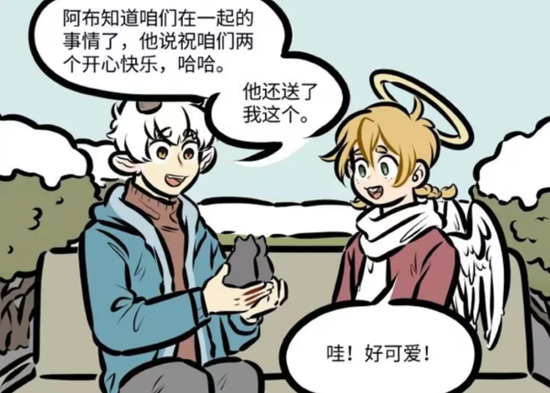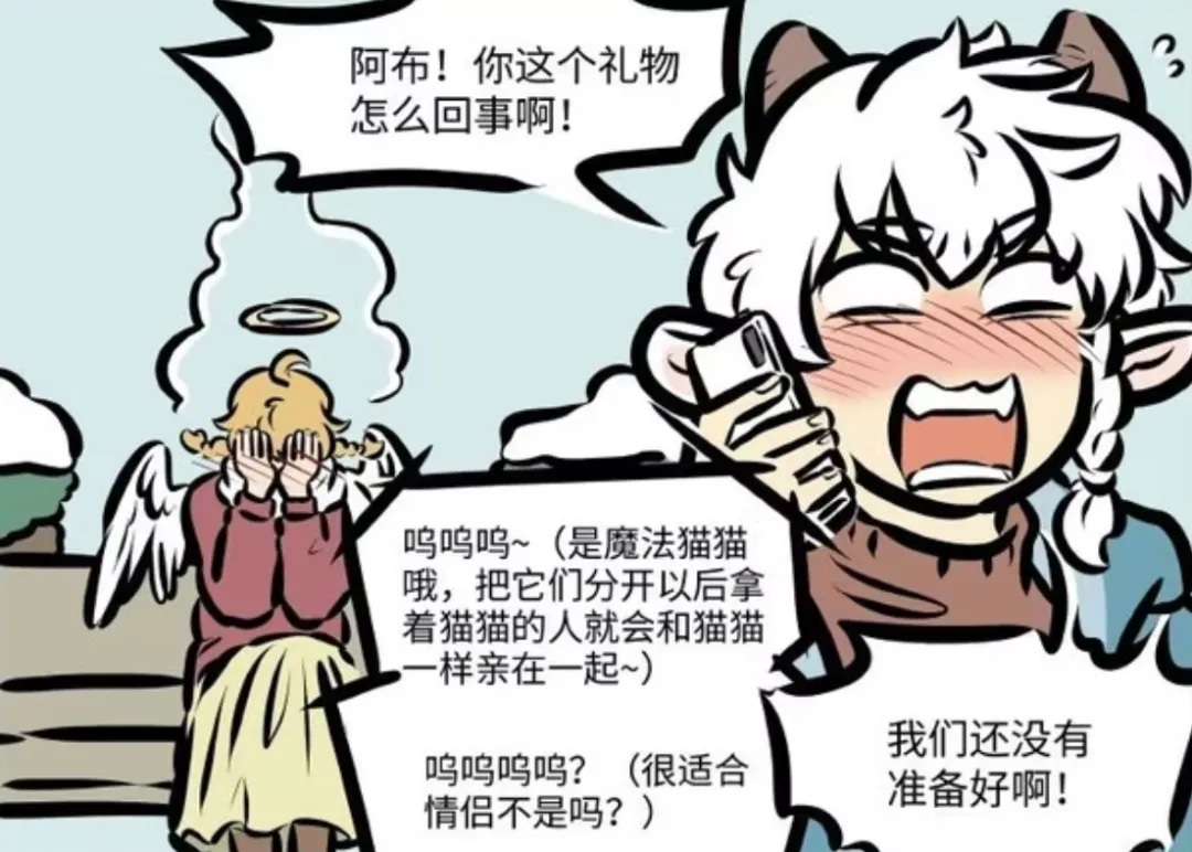 大家好,这里是随心二次元。《1031万圣街》漫画版第578话,在占卜下,阿布还是知道了泥泥和莉莉的恋情。泥泥看瞒不住也就不好意思的承认了,并且告诉阿布因为林老师,希望阿布保密。阿布保证会保密,并小跑出去让泥泥等他,要送俩人一个礼物!不多时,阿布拿来一对可爱的亲吻猫猫,泥泥带着礼物和莉莉送给莉莉。毫不知情的泥泥和莉莉还觉得猫猫带磁铁挺好玩,下一秒就因为猫猫的缘故甜蜜亲吻。害羞不已的俩人只能找阿布无奈吐槽他们并没有准备好。