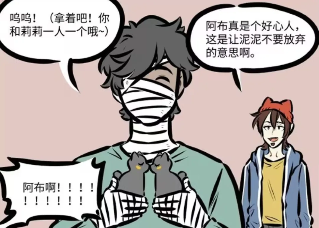 不一会儿,阿布捧着一对可爱的亲吻猫咪玩偶递给泥泥,让泥泥拿着,和莉莉一人一个!恰巧艾勒经过,先入为主的以为阿布就是纯纯的好心,因为占卜说了“不可能”现在更是拿出这样的礼物让泥泥不要放弃!