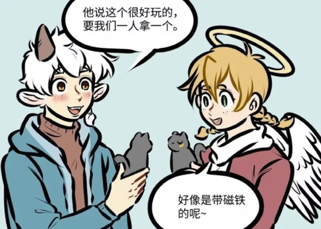 泥泥递给了莉莉一只,自己手里拿着一只。告诉莉莉,阿布说这个猫猫很好玩,要我们一人拿一个。接过猫猫的莉莉,发现两只猫猫之间好像带着吸力,不免有些惊奇的告诉泥泥,好像是带磁铁的。
