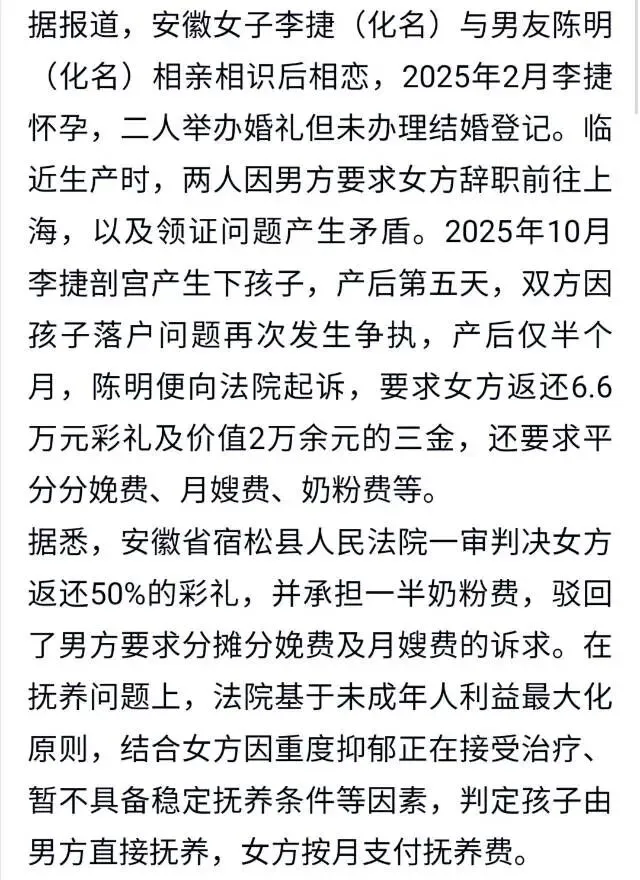 近期,安徽女子产后半个月遭男友起诉退彩礼事件闹得沸沸扬扬。 首先,作为女性,我心疼这位刚为人母的妈妈;其次,广大男同胞们,你们怎么看待事件中的男主人公? 生过孩子的妈妈们都知道,生孩子就是在鬼门关走一遭。这位年轻的妈妈刚从鬼门关出来,就要承受椎心之痛:十月怀胎,历尽千辛万苦生下来的孩子就要与她分离了,最扎心的还是那个她心中的男人对她的背后一箭。 其实大部分的产妇都会有产后抑郁,只不过有人轻得让人觉察不到,有人则严重的需要靠药物治疗。 关于抚养权,法院因女方患重度抑郁且正在医院接受治疗,将抚养权判归男方。法律规定,2周岁以下的子女一般随母方生活,但母方有下列情形之一的,可随父方生活: