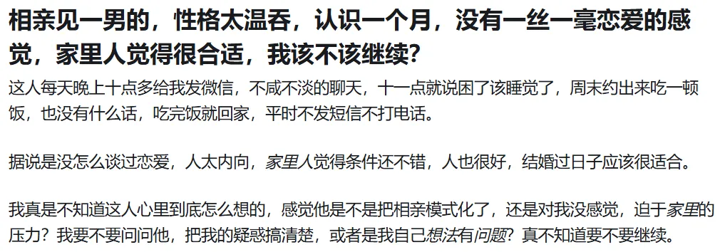 否则家里人说"条件不错"说了三个月,你硬着头皮聊,临了轻飘飘一句"没感觉"——到底是谁在付出,谁在获利,谁没感觉呢?