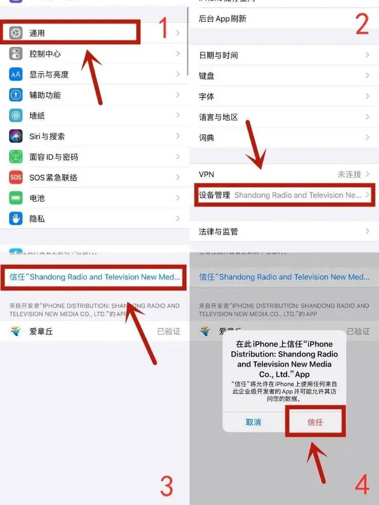 温馨提示:如果您用的是苹果手机,根据下图步骤选择信任软件,即可正常使用“爱章丘”手机客户端了。