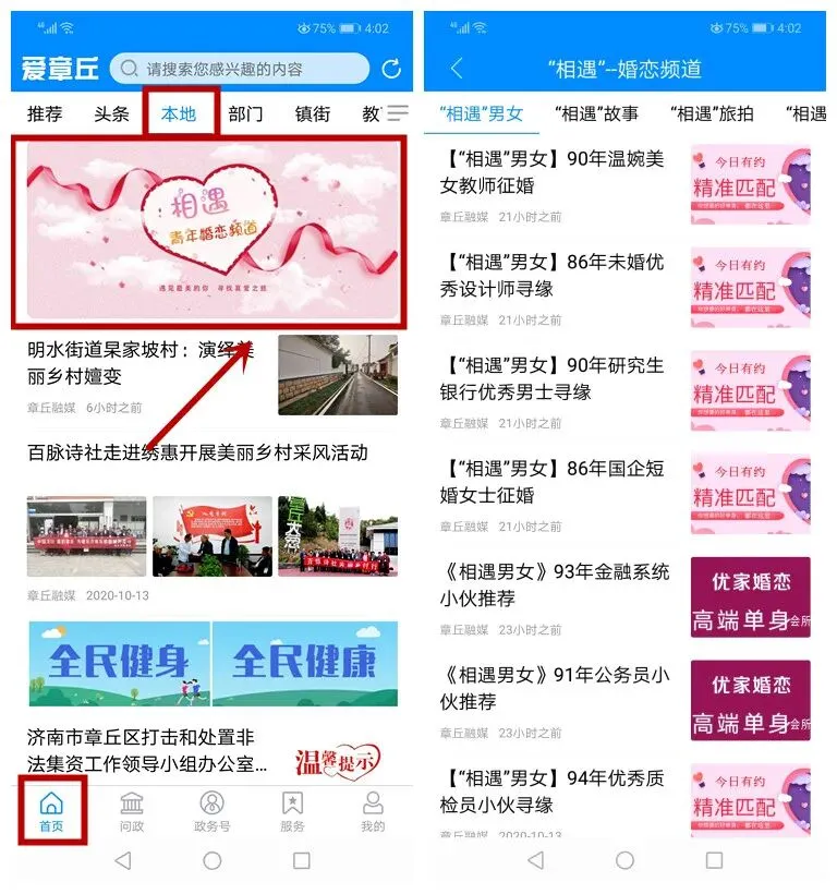 2.打开“爱章丘”手机客户端进入首页,点击本地板块顶端图片即可进入婚恋频道。