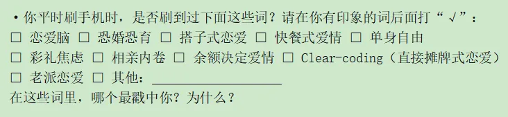 选修课上,我列了一张清单,上面是这些年网上流传的恋爱热词:恋爱脑、恐婚恐育、搭子式恋爱、快餐式爱情、单身自由、彩礼焦虑、余额决定爱情……