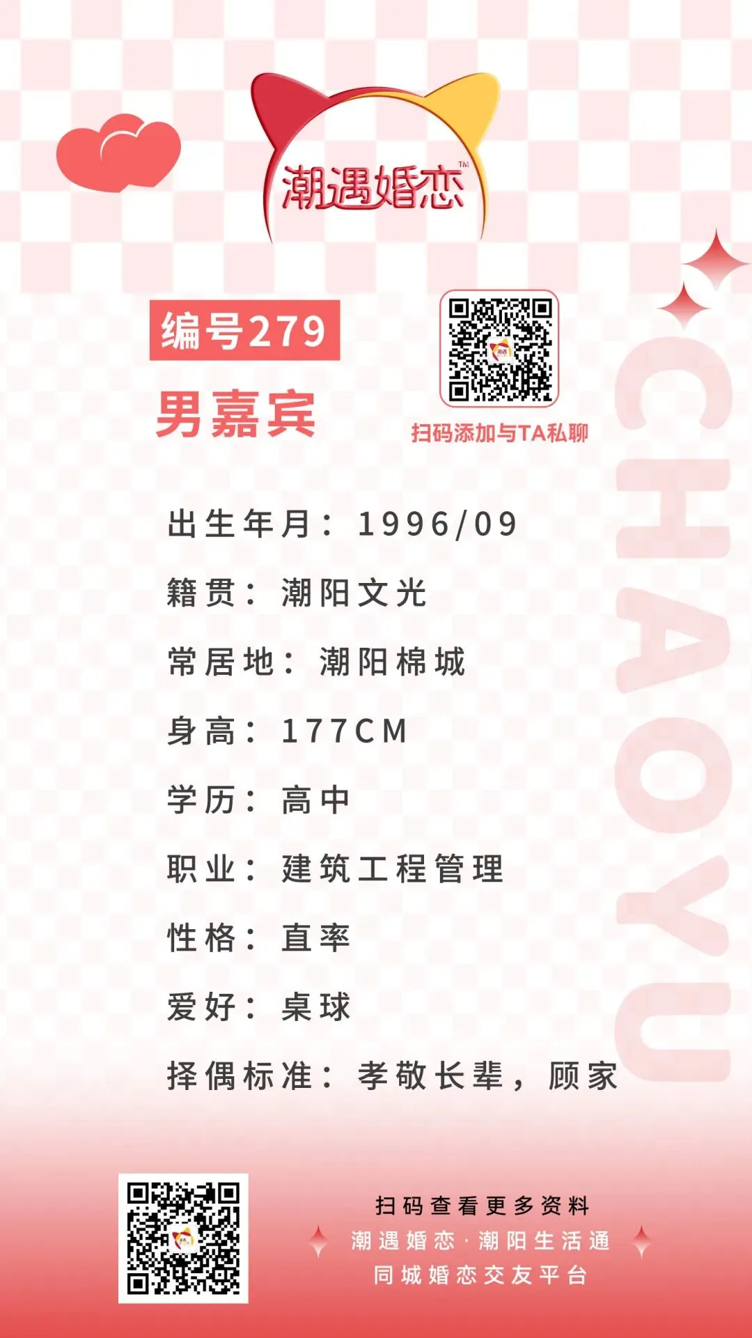 【潮遇婚恋】嘉宾:编号279号男嘉宾 · 常居潮阳棉城,有房有车~