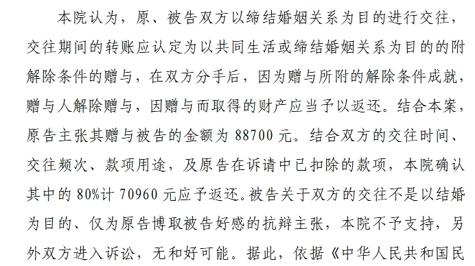 小张越想越不甘心,找到了我,看了他们两个月完整的聊天记录,鉴于其中提及了见父母结婚的这些事宜,综合判断返还比例不低,代理之后整理了转账记录、聊天记录,最终法院判决返还了总金额的80%。