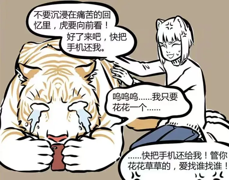 在非人哉漫画中,神兽精怪也会谈恋爱的,同样也会面临爱情上的各种事情,甚至是失恋。一般来说,失恋的感觉真的很难受。哮天面对小玉的拒绝,那可谓是愈战愈勇。四大神兽之一的白虎也遇到了失恋,九月并不想安慰,但是没办法,为了拿回自己的手机,只能被迫化身为恋爱大师,开导痛哭的白虎,下面就让我们一起来看看吧。