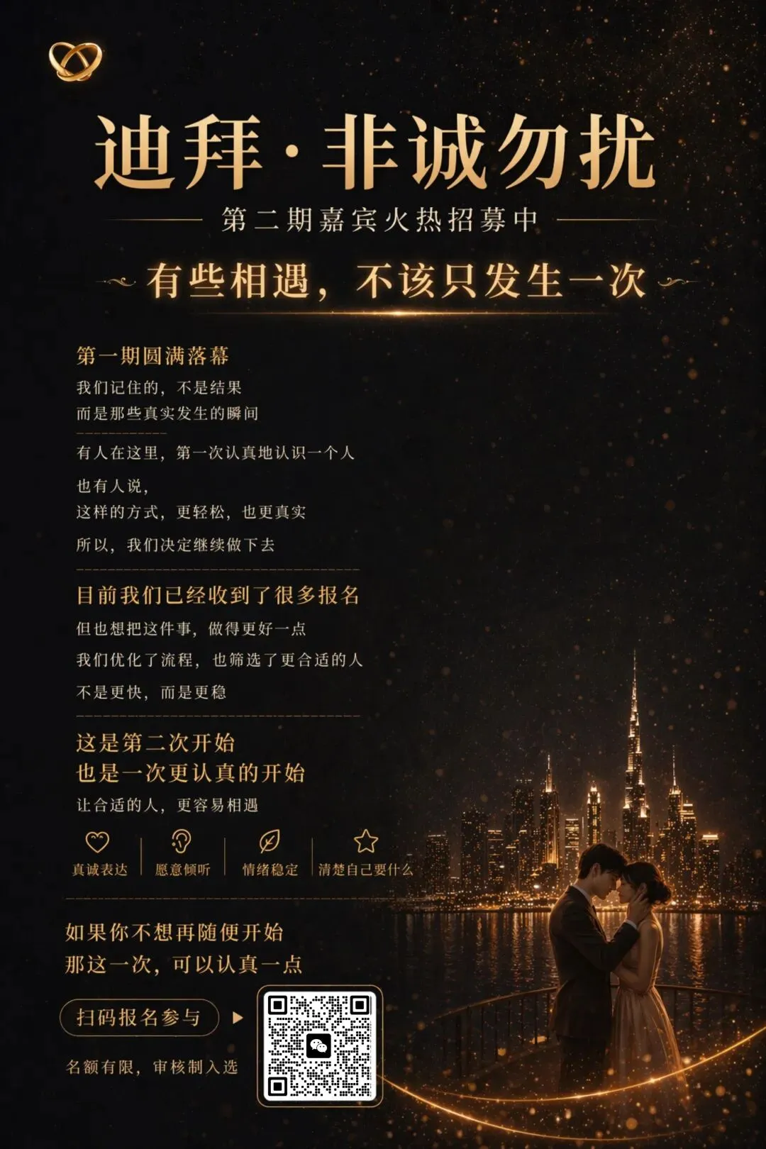 活动全程不收取任何费用💰❌,主办方表示,希望通过这样的形式,为在迪拜生活的单身人群提供一个高质量的交流机会,让更多人有机会相识、相知。
